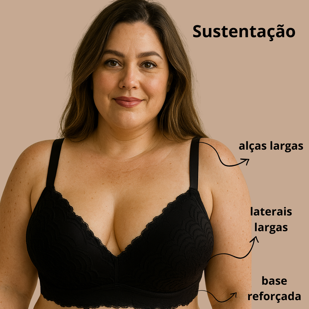 - Uma ótima base de sustentação para os seus seios não sairem por baixo e nem deixarem todo o peso para as alças – Porque aí essas alças vão acabar com os seus ombros.