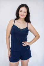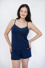 Desfrute de uma noite de sono inesquecível com este pijama de liganete amni. O toque suave e o frescor do tecido garantem conforto total. Este pijama feminino de alcinha apresenta detalhes em renda que adicionam elegância e um toque delicado. No charmoso azul marinho e Branco, este pijama short doll é perfeito como lingerie para dormir, unindo estilo e bem-estar.