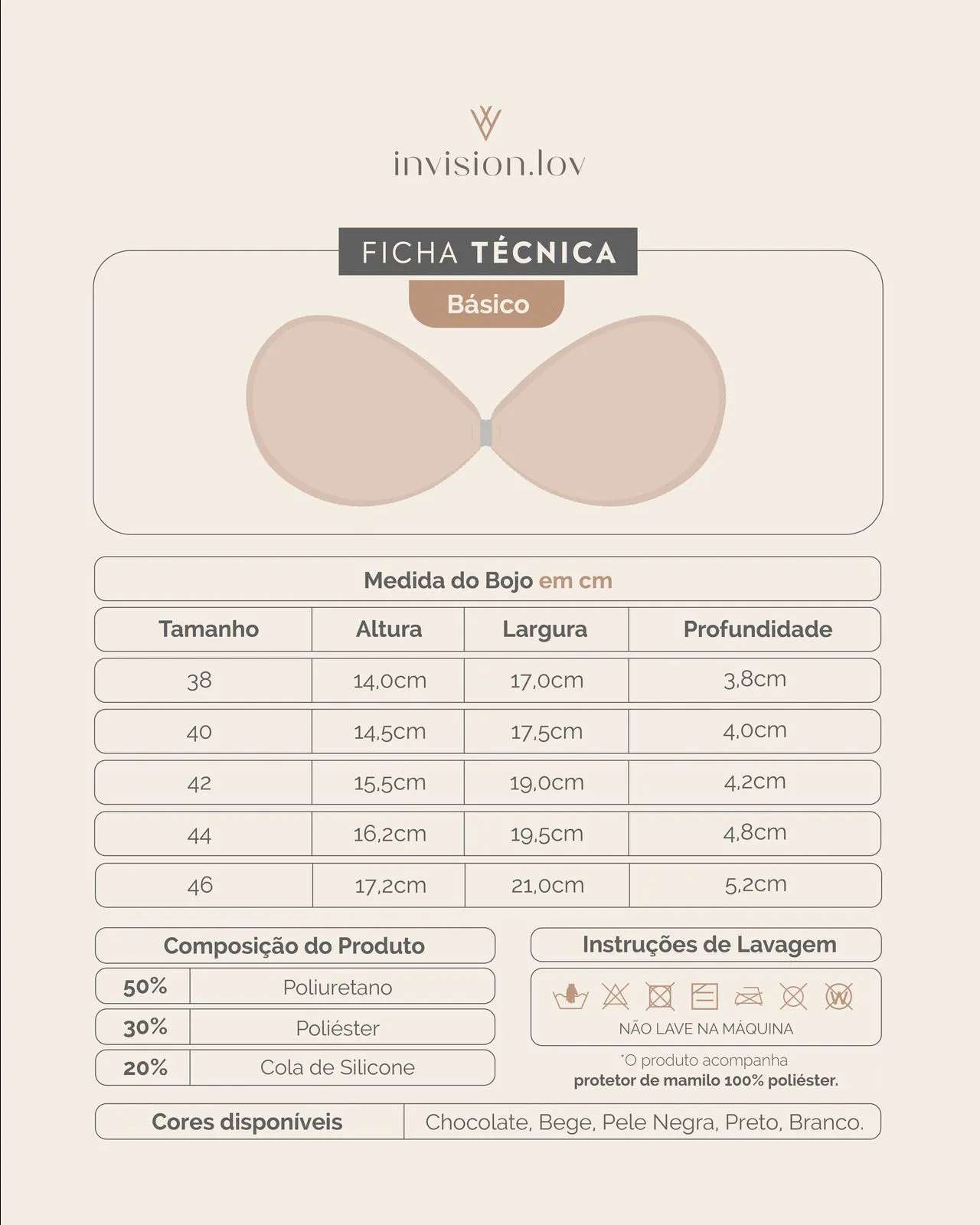 Sutiã adesivo com cobertura de tecido e silicone medicinal na parte interna. Adere perfeitamente aos seios, é discreto e oculto, deixando os looks com muito charme e elegância.