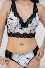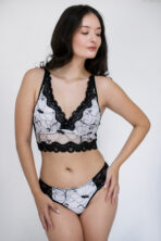 Este Top com bojo é a fusão perfeita de conforto e estilo. O top de renda em preto e branco apresenta um design floral com um toque de transparência que o torna uma peça versátil. Suas alças finas e a renda preta criam detalhes delicados, transformando este cropped de renda em uma lingerie elegante e moderna, perfeita para um visual ousado ou discreto.